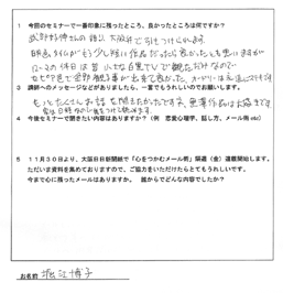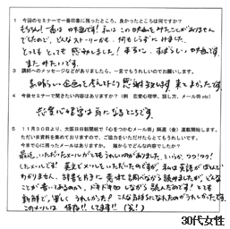 - 瀬川さんの話し方、やわらかくあたたかさを感じました。また機会があれば参加したいと思います。(30代女性)